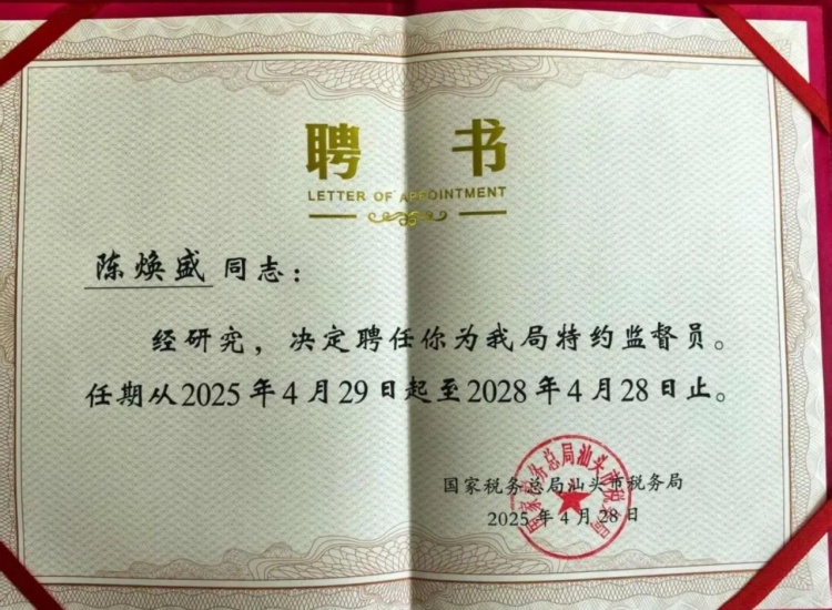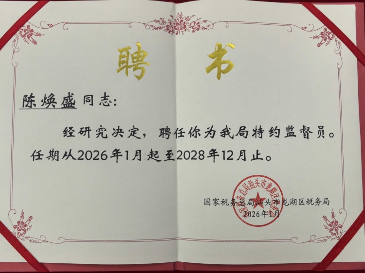 目前,陈焕盛同志已连续获得多家税务机关的聘书与信任。2025年4月,国家税务总局汕头市税务局批准聘任陈焕盛同志为特约监督员;2026年1月,陈焕盛获聘为国家税务总局汕头市龙湖区税务局特约监督员。陈焕盛连续获聘多地税务局特约监督员,不仅体现了各级税务机关对社会监督工作的高度重视,更持续而有力地印证了对陈焕盛同志在专业领域的高度认可与持续信任。